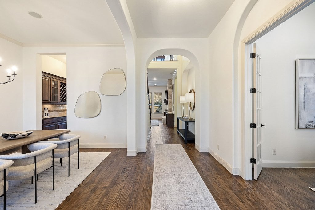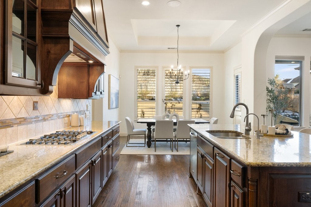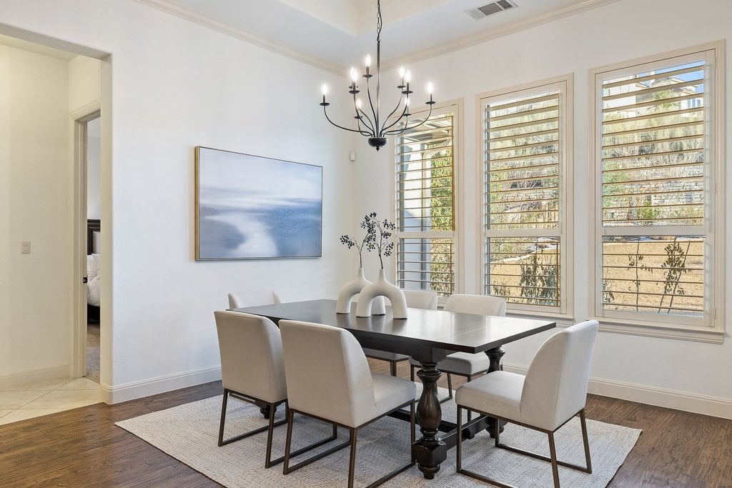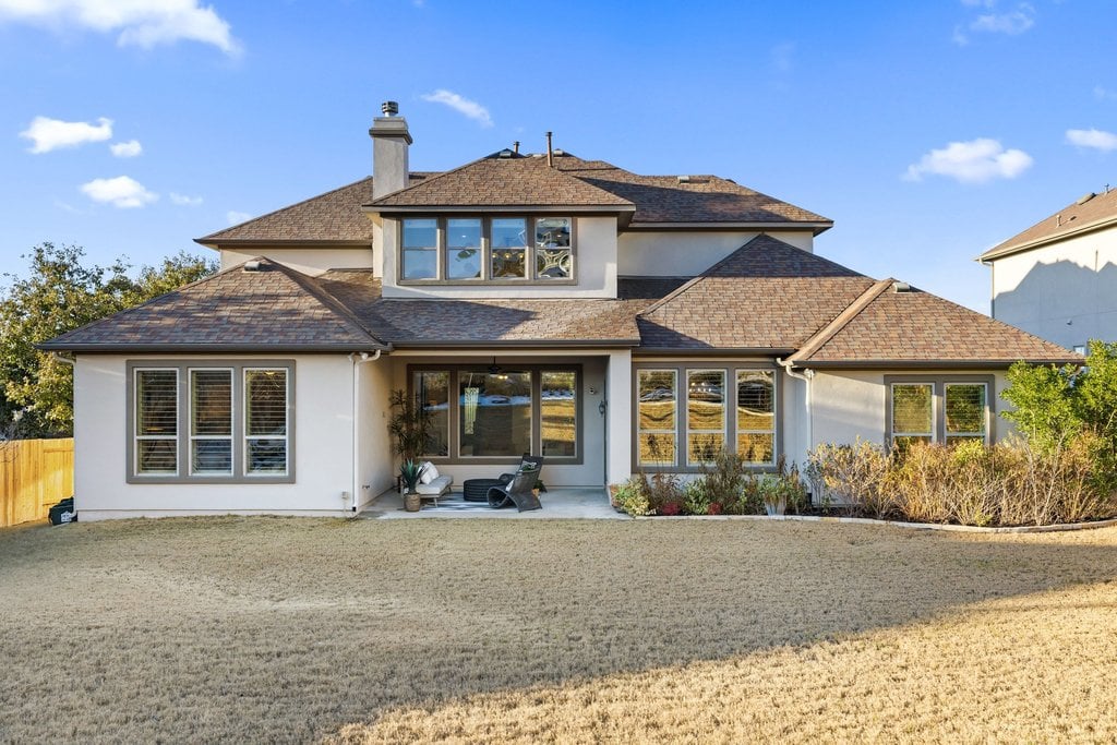 Nestled within the gated enclave of Davenport Summit in Sweetwater, this stunning Drees Custom Home combines timeless elegance with modern comfort. Spanning an impressive 4,602 square feet on over 1/3 of an acre, this meticulously maintained home offers space and privacy. Inside, you'll find 5 bedrooms, 5 bathrooms, a dedicated office, a media room, a game room, and a roomy 3-car garage. From the moment you step through the striking Cantera metal door, you're greeted by freshly painted walls, rich solid hardwood flooring, and wood plantation shutters that add warmth and sophistication to every corner. The chef-inspired kitchen will elevate your culinary adventures, boasting a six-burner KitchenAid cooktop, a generous center island, and an abundance of high-end cabinetry, complete with oversized pot-and-pan drawers. A butler’s area and a walk-in pantry ensure everything has its place, making both cooking and entertaining a breeze. The main level is thoughtfully designed with a spacious primary suite and a private guest ensuite, while upstairs offers three additional bedrooms, a media room, and a game room outfitted with a wet bar—perfect for hosting friends and family. Step outside to discover a backyard oasis with endless potential. With no steps leading to the yard and plenty of room to add a pool, this space is ready to be transformed into your personal retreat. Located in the amenity-rich Sweetwater community where residents enjoy two beautiful resort style pools, a community only gym, pickleball, sand volleyball and basketball courts, a dog park, numerous pocket parks throughout, miles of hiking and biking trails and community sponsored events and activities. Easy access to the lake, airport and downtown. Located in acclaimed Lake Travis ISD.